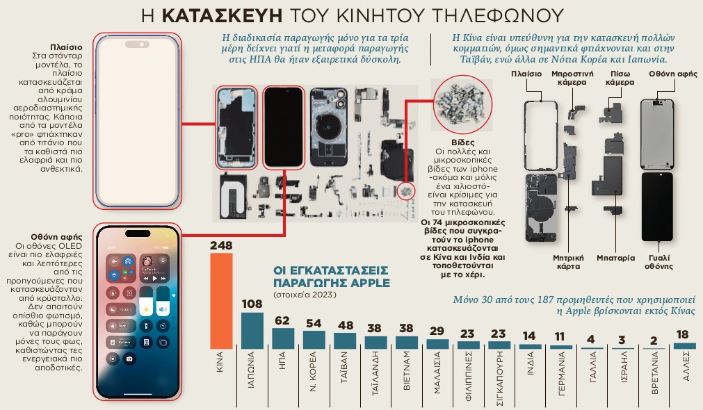 Οι ειδικοί σημειώνουν πως το προσωπικό που εργάζεται στα iPhones είναι το πλέον εξειδικευμένο. Η Apple εξάγει πάνω από 230 εκατομμύρια iPhones τον χρόνο, που σημαίνει ότι παράγει περίπου 438 το λεπτό! Ολα τα εξαρτήματά τους κατασκευάζονται σε ασιατικές χώρες και αυτή η εγγύτητα είναι κρίσιμη τόσο για την παραγωγή όσο και για τη μείωση του κόστους. «Σημαίνει πως μπορείς να έχεις παραλαβές πολύ γρήγορα και να επικοινωνήσεις με τον προμηθευτή σου άμεσα. Δεν μεσολαβεί ένας ωκεανός», σημειώνει ο καθηγητής Τσέι.