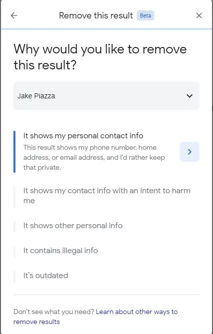 Μπορείτε επίσης να χρησιμοποιήσετε αυτόν τον σύνδεσμο για να υποβάλετε αίτηση για ευρύτερους λόγους. Αν θέλετε να αφαιρέσετε προσωπικές πληροφορίες, επιλέξτε την επιλογή “Περιέχει προσωπικές σας πληροφορίες”.