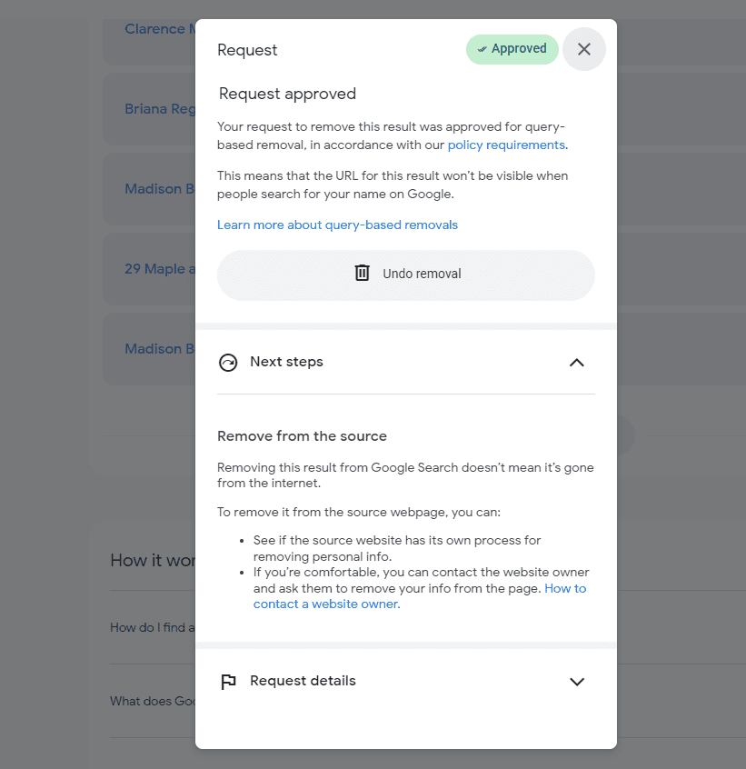 Αυτό είναι το πως θα εμφανιστεί όταν η αίτησή σας για αφαίρεση προσωπικών πληροφοριών εγκριθεί. Μπορείτε να παρακολουθήσετε την αίτησή σας πηγαίνοντας στην ενότητα “Δεδομένα και προσωπικό απόρρητο” του λογαριασμού σας Google. Κύληστε προς τα κάτω και πατήστε “Η δραστηριότητά μου”. Στη συνέχεια πατήστε τις τρεις κουκκίδες στην μπάρα αναζήτησης και επιλέξτε “Άλλη δραστηριότητα”. Πατήστε “Διαχείριση αποτελεσμάτων για εσάς” για να δείτε την κατάσταση.