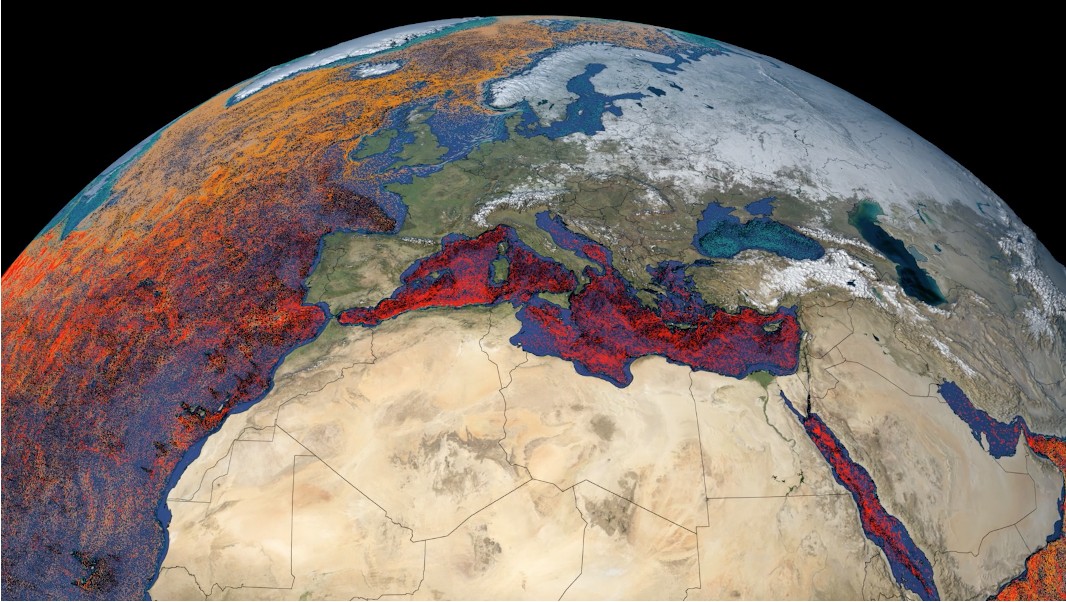 Ανάμεσα στις ωκεάνιες λεκάνες, η Μεσόγειος Θάλασσα καταλαμβάνει μια ιδιαίτερη θέση. Αποκομμένη από τον Ατλαντικό, με εξαίρεση τη στενή δίοδο του Πορθμού του Γιβραλτάρ, η Μεσόγειος παρουσιάζει μοναδικά φυσικά χαρακτηριστικά που την καθιστούν εστία επιστημονικού ενδιαφέροντος. Το ECCO αναδεικνύει αυτές τις ιδιαιτερότητες με λεπτομερή τρόπο. Οι απεικονίσεις του δείχνουν τη Μεσόγειο να «λάμπει» σε κόκκινες και σκούρες αποχρώσεις, σημάδι της υψηλής αλατότητας της. Η έντονη εξάτμιση σε συνδυασμό με περιορισμένη ανανέωση των υδάτων οδηγεί σε συσσώρευση άλατος, καθιστώντας τη Μεσόγειο μία από τις πιο αλμυρές θάλασσες του κόσμου. Αυτό επηρεάζει όχι μόνο τη θαλάσσια ζωή αλλά και τα κυκλοφορικά μοτίβα που αλληλεπιδρούν με το Ρεύμα του Κόλπου μέσω της αλληλεπίδρασης στο Γιβραλτάρ.