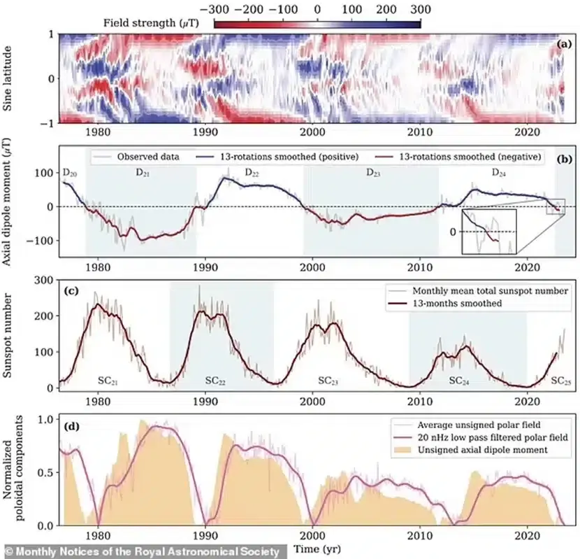 Ο Δρ. Nandi και οι συνάδελφοί του κατάφεραν να βρουν έναν νέο τρόπο ανίχνευσης του ηλιακού μέγιστου, αλλά η κατανόησή του απαιτεί κάποιες βασικές γνώσεις για το ζωογόνο άστρο του ηλιακού μας συστήματος. Ο ήλιος είναι μια τεράστια σφαίρα ηλεκτρικά φορτισμένου θερμού αερίου που κινείται, δημιουργώντας ένα ισχυρό μαγνητικό πεδίο, επίσημα γνωστό ως διπολικό πεδίο. Αυτό το διπολικό πεδίο – το οποίο εκτείνεται από τον ένα πόλο του ήλιου στον άλλο, όπως και το γήινο – διανύει έναν κύκλο, που ονομάζεται ηλιακός κύκλος.