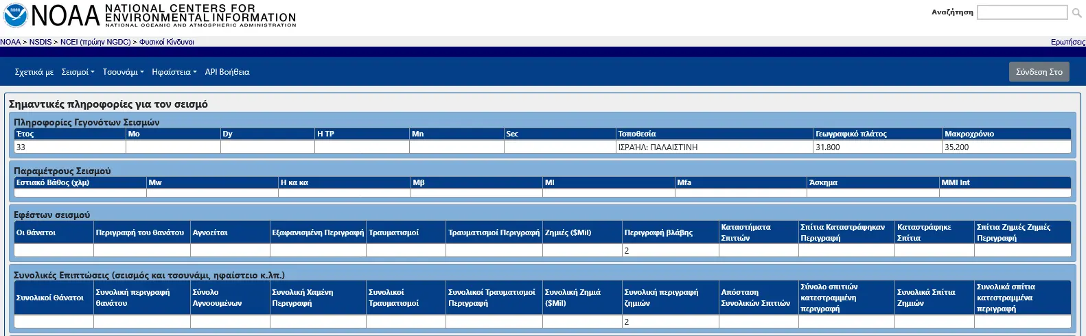 Σύγχρονες βάσεις δεδομένων φυσικών φαινομένων, όπως εκείνες του NOAA (National Oceanic and Atmospheric Administration) και των National Centers for Environmental Information (NCEI), περιλαμβάνουν καταγραφές ιστορικών σεισμών από αρχαίες πηγές και γεωλογικές μελέτες. Σε αυτές τις καταγραφές εμφανίζεται σεισμικό γεγονός που χρονολογείται περίπου στο 33 μ.Χ. στην περιοχή της Παλαιστίνης, κοντά στις γεωγραφικές συντεταγμένες 31.8° βόρειο πλάτος και 35.2° ανατολικό μήκος, δηλαδή στην ευρύτερη περιοχή της Ιερουσαλήμ.