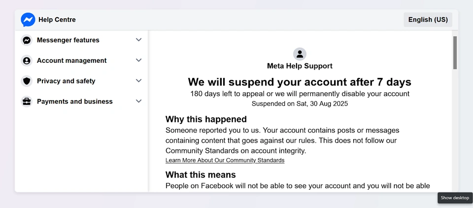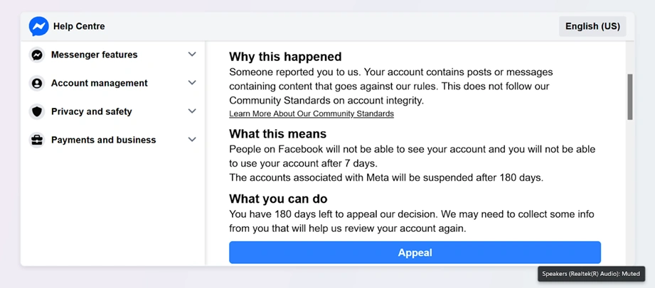 Οι χρήστες του Facebook λαμβάνουν μηνύματα που περιέχουν συνδέσμους μεταμφιεσμένους σε ειδοποιήσεις αποκλεισμού λογαριασμού, στο πλαίσιο αυτής της κακόβουλης εκστρατείας.