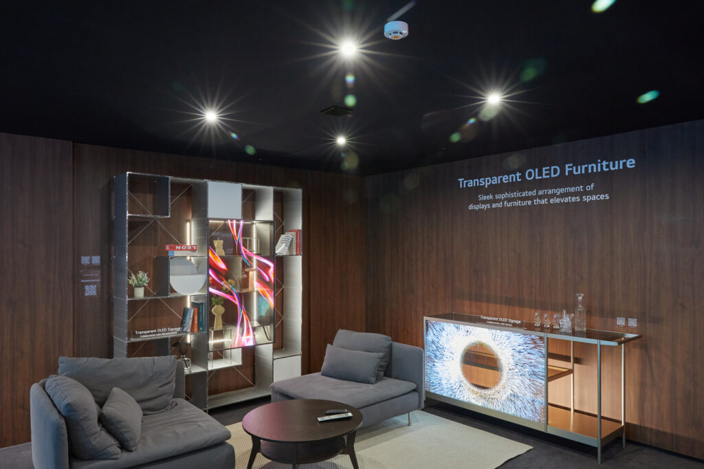 Η LG παρουσίασε την 55” Transparent OLED Bookshelf, που σχεδιάστηκε σε συνεργασία με τη Monstructure, προσφέροντας έναν κομψό τρόπο διαχωρισμού και σύνδεσης χώρων. Επιπλέον, το Transparent OLED Trolley, αποτέλεσμα συνεργασίας με την Alephus, συνδυάζει εντυπωσιακό design με πρακτικότητα. Οι λύσεις αυτές μπορούν να φιλοξενήσουν ψηφιακό περιεχόμενο μέσω της πλατφόρμας LG SuperSign Cloud, δημιουργώντας μία premium ατμόσφαιρα στον χώρο υποδοχής μιας επιχείρησης.