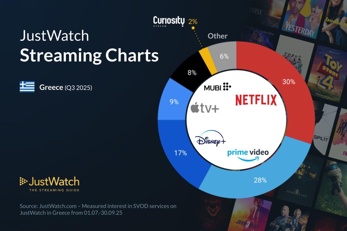 Το Netflix παραμένει η πιο δημοφιλή πλατφόρμα streaming στην Ελλάδα, με 30% μερίδιο αγοράς, σύμφωνα με τα στοιχεία της JustWatch για το Q3 2025. Παρά ταύτα, τα στοιχεία Ιανουαρίου–Σεπτεμβρίου δείχνουν ότι η πλατφόρμα καταγράφει βαθμιαία κάμψη, πέφτοντας από περίπου 34% στην αρχή της χρονιάς στο 30% τον Σεπτέμβριο.