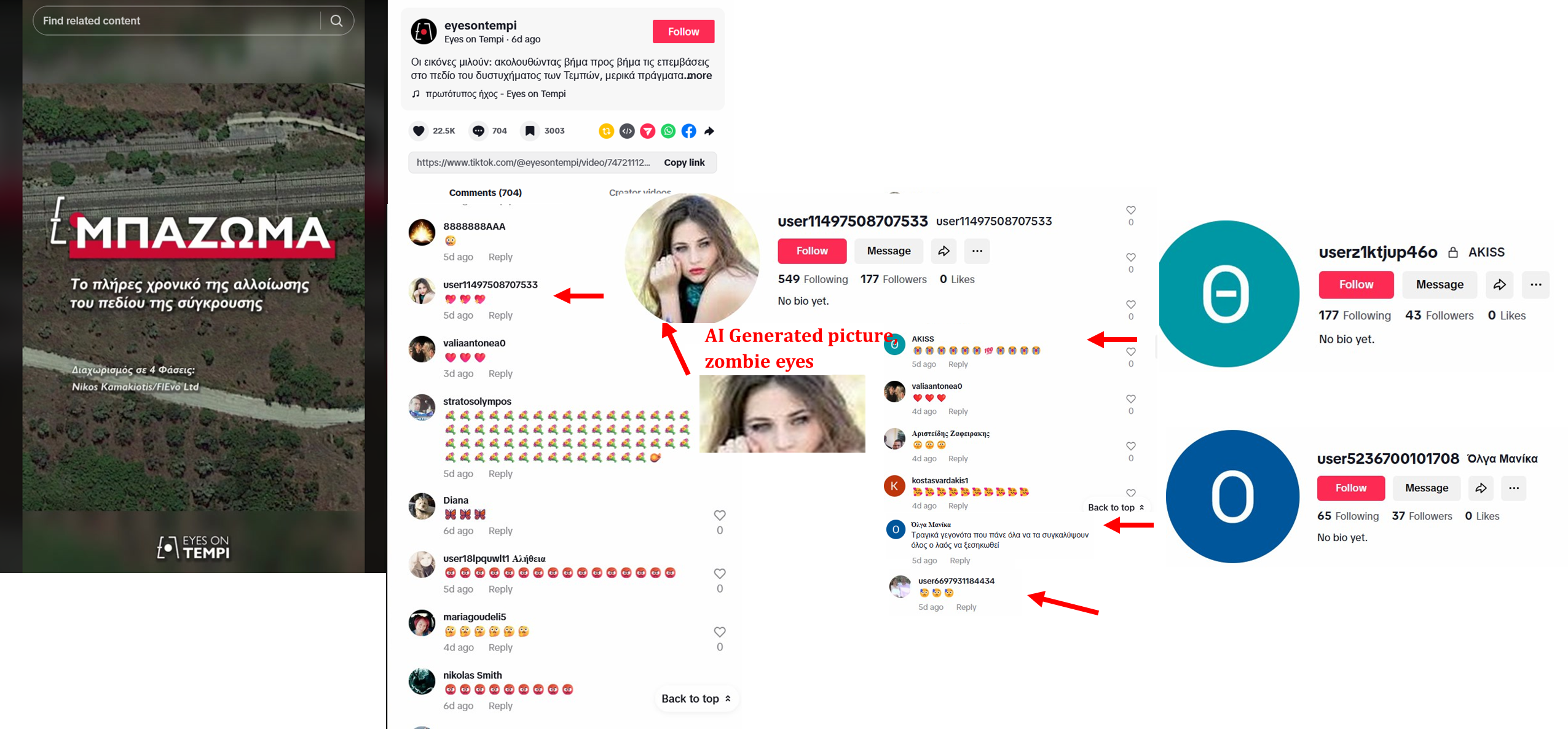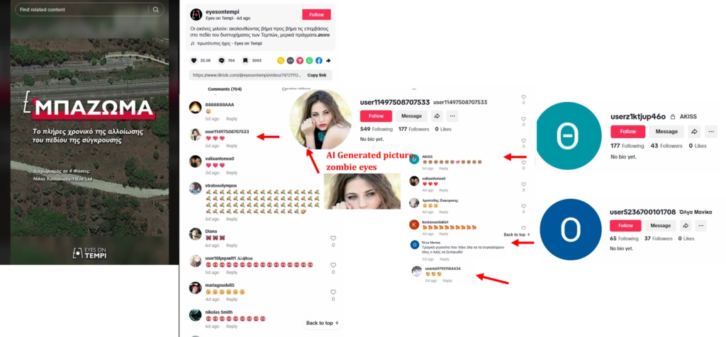 Για παράδειγμα, μια σελίδα στο TikTok με τίτλο «Eyes on Tempi», προωθείται και ακολουθείται από πολλά bots, συμπεριλαμβανομένων προφανώς αυτών με εικόνες που δημιουργούνται από τεχνητή νοημοσύνη και αμετάβλητα, αυτόματα δημιουργημένα, ονόματα όπως user11497508707533 και userz1ktjup46o.