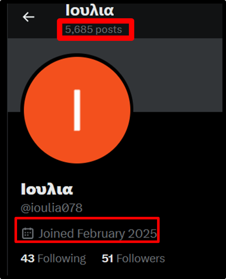 Κατά την ανάλυση της «εμπλοκής» [σχόλια και αντιδράσεις] δύο δεκάδων συγκεκριμένων αναρτήσεων στο Tik Tok που σχετίζονται με την ελληνική διαμαρτυρία της 28ης Φεβρουαρίου, βλέπουμε ότι πολλές από τις αντιδράσεις που έγιναν σε αυτές τις αναρτήσεις προέρχονταν από λογαριασμούς που δημιουργήθηκαν όχι νωρίτερα από τον Δεκέμβριο του 2024.