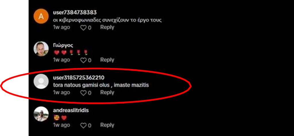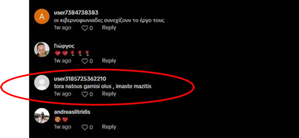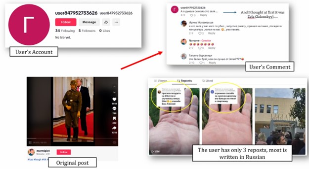 Ένα παράδειγμα είναι ο «πιασάρικος» χρήστης, γνωστός με το ψευδώνυμο user8497952733626, ο οποίος έχει 0 likes και 5 followers, όταν σχολίασε μια εικόνα του Έλληνα πρωθυπουργού Μητσοτάκη που παρήγαγε η τεχνητή νοημοσύνη, χρησιμοποίησε ρωσικά, ενώ οι προηγούμενες αναρτήσεις του ήταν στα ρωσικά.