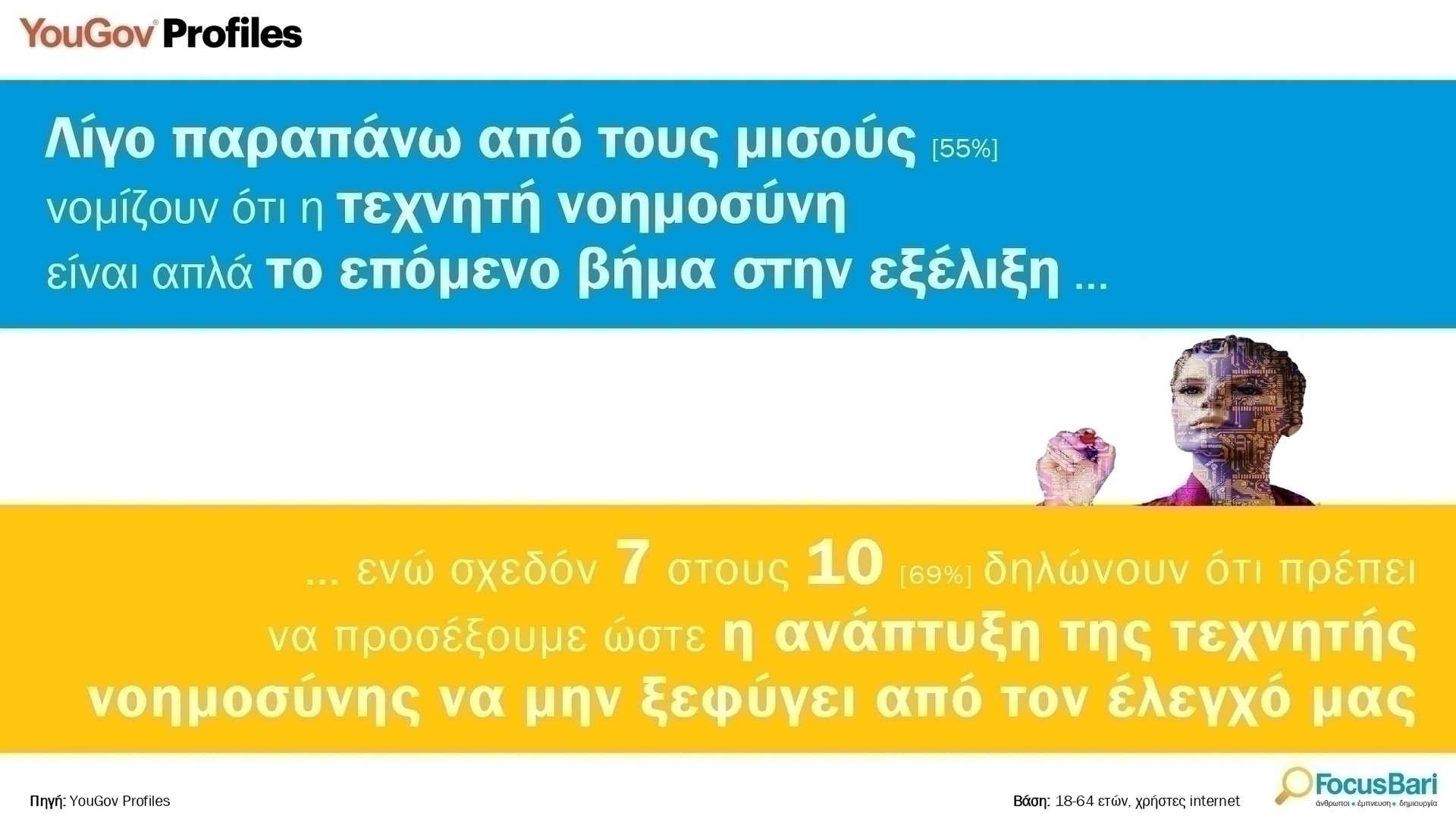 Η Τεχνητή Νοημοσύνη έρχεται στο προσκήνιο, με πάνω από τους μισούς να την θεωρούν θετική εξέλιξη στην πρόοδο της τεχνολογίας. Ωστόσο, επτά στους δέκα εκφράζουν ανησυχία για το ενδεχόμενο η Τεχνητή Νοημοσύνη να “ξεφύγει από τον έλεγχο”.