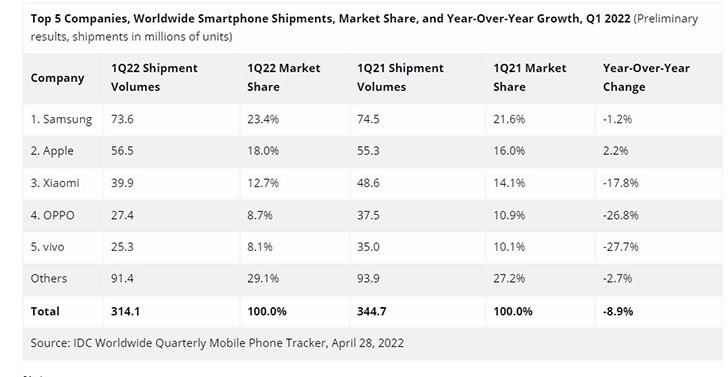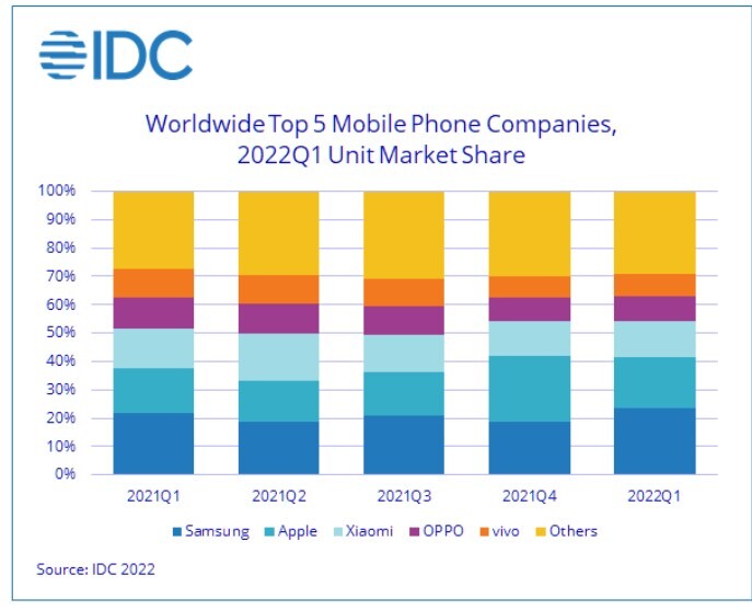 Παρά το δύσκολο περιβάλλον, η κατάταξη των κορυφαίων κατασκευαστών smartphones δεν άλλαξε κατά το 1ο τρίμηνο του 2022. Η Samsung ηγήθηκε της κούρσας, καταλαμβάνοντας την πρώτη θέση και μερίδιο 23,4%, το μεγαλύτερο μερίδιο από το 1ο τρίμηνο του 2018. Η Apple ήρθε δεύτερη με μερίδιο 18,0%, ενώ οι Κινέζοι πωλητές Xiaomi, OPPO και vivo ακολούθησαν το επόμενο τρεις θέσεις με μερίδιο 12,7%, 8,7% και 8,1% αντίστοιχα.