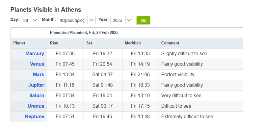 Οι ορατοί πλανήτες στον ουρανό της Αθήνας στις 28 Φεβρουαρίου σύμφωνα με το Time and Date:
