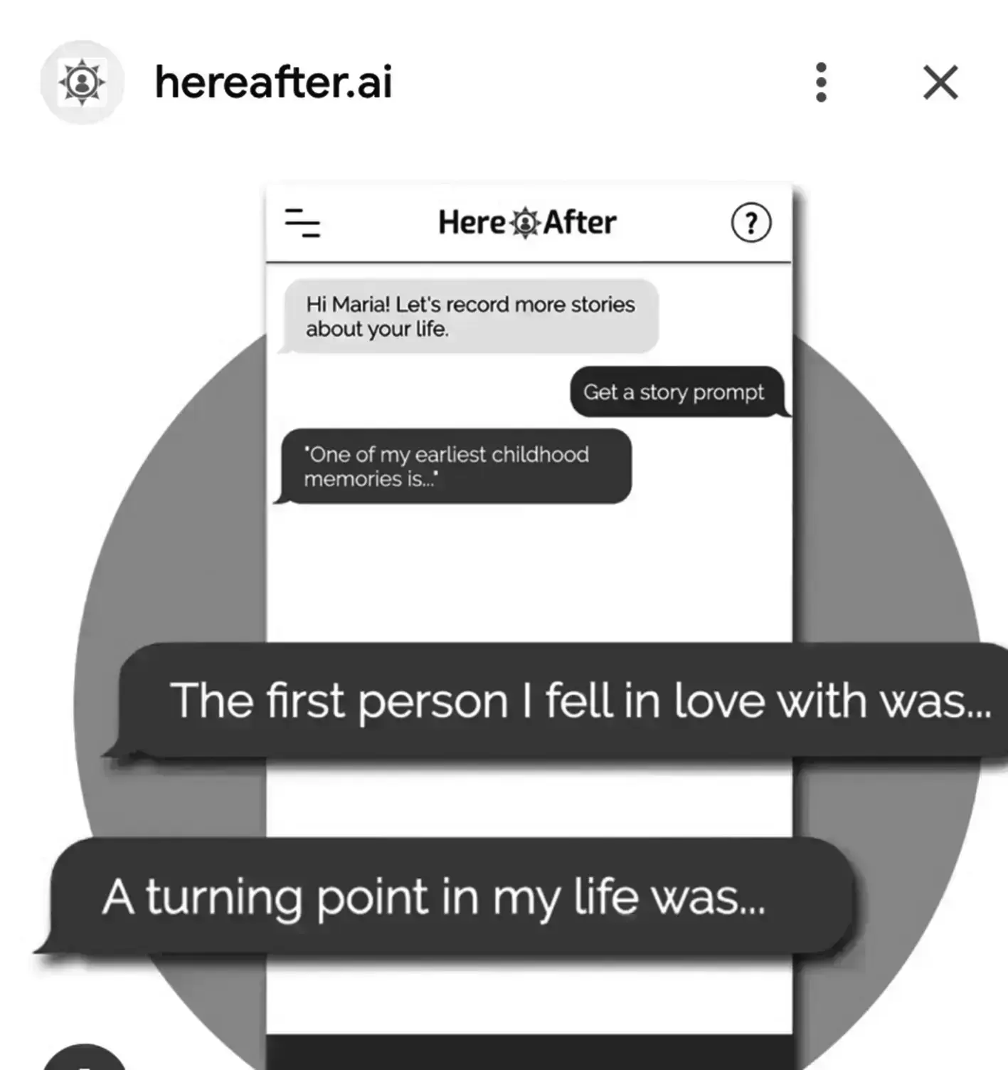 Η ψηφιακή εφαρμογή HereAfter AI δεν περιλαμβάνει απλές ηχογραφήσεις ή βίντεο ασθενών σε τελικό στάδιο που εξιστορούν περιπέτειές τους ή ευτράπελα για να αφήσουν πίσω σε παιδιά και εγγόνια. Χάρη στη χείρα βοηθείας της Τεχνητής Νοημοσύνης προσφέρει μια διαδραστική εμπειρία στους χρήστες.