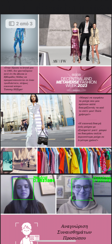 Εξήγησε δε, ότι «συνεργαστήκαμε με μια διδάκτορα του Αριστοτελείου Πανεπιστημίου Θεσσαλονίκης που μας έδωσε έναν κώδικα, τον οποίο επεξεργάστηκαν τα παιδιά και με αυτόν, αφού αγοράσει κάποιος το ρούχο και του έρθει, βγάζει μια “selfie”, που ανεβαίνει σε μια πλατφόρμα, η οποία αναγνωρίζει το συναίσθημα που έχει αυτός που φοράει το ρούχο», σημείωσε ο υπεύθυνος καθηγητής του “Fashion Lab”. Επιπλέον, όπως εξήγησε, τα παιδιά κατάφεραν μόνα τους και δημιούργησαν ένα πρότυπο Avatar, που αλλάζει ρούχα, το οποίο και παρουσίασαν μαζί με το σύνολο της εφαρμογής στη σχετικά πρόσφατη Μαθητική Εμπορική Έκθεση Θεσσαλονίκης 2023.
