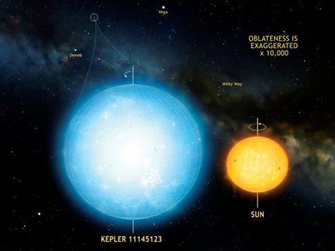 Όμως οι επιστήμονες ανακάλυψαν ένα άστρο που είναι σχεδόν ολοστρόγγυλο. Πρόκειται για το καυτό και πολύ φωτεινό άστρο «Κέπλερ 11145123», σε απόσταση 50.000 ετών φωτός, το οποίο είναι υπερδιπλάσιο από τον Ήλιο μας και περιστρέφεται τρεις φορές πιο αργά από αυτόν.