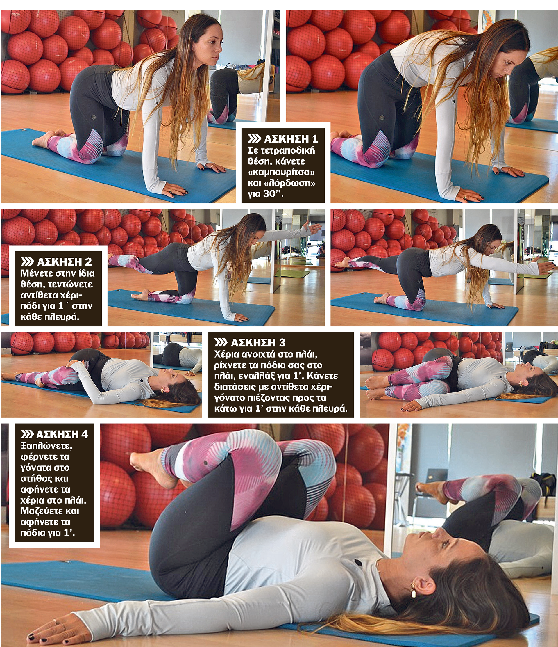 Eτσι, η Μάντυ Περσάκη, καθηγήτρια Φυσικής Αγωγής και ιδιοκτήτρια των γνωστών studios «Pilates By Mandy & More», σας προτείνει να ακολουθήσετε το παρακάτω πρόγραμμα ασκήσεων, 3-4 φορές την εβδομάδα.