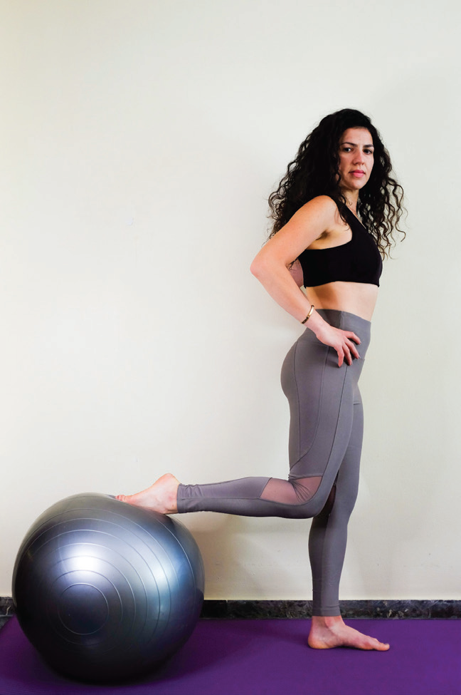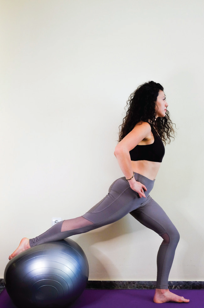 Σπρώξτε την μπάλα με το πίσω πόδι να τεντώσει και λυγίστε το μπροστινό πόδι. Προσοχή, το μπροστινό γόνατο να μην ξεπερνά τα δάχτυλα του ποδιού. Εκτελέστε 3 σετ από 12 επαναλήψεις.
