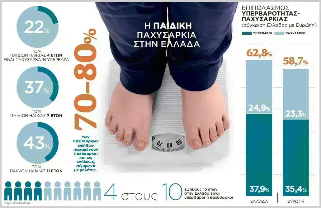 Σύμφωνα με την πιο πρόσφατη μελέτη «Ρέα», που κατέγραψε το πρόβλημα στη χώρα μας, οι 4 στους 10 (40%) εφήβους ηλικίας 15 ετών είναι υπέρβαροι ή παχύσαρκοι. Στην ίδια μελέτη διαφαίνεται μια διαχρονικά αυξανόμενη τάση στα ποσοστά υπερβαρότητας – παχυσαρκίας στα παιδιά, ανάλογα με την ηλικία.