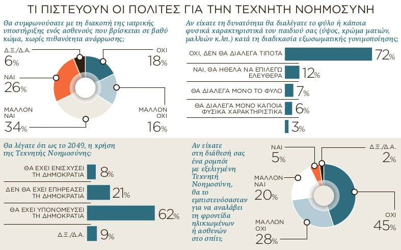 Η συνολική εικόνα δείχνει μια κοινωνία επιφυλακτική, ακόμα και φοβική, απέναντι στην τεχνολογική παρέμβαση στο σώμα και την υγεία, ιδιαίτερα όταν αυτή προτείνεται χωρίς σαφές ανθρώπινο έλεγχο. Αναλυτικότερα, καταγράφηκαν τα εξής: