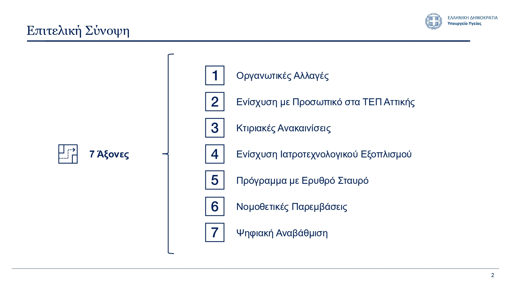 Οι αλλαγές όπως είπε θα γίνουν σταδιακά και όχι από τη μία μέρα στην άλλη. Οι αλλαγές αυτές κινούνται σε 7 άξονες, μεταξύ των οποίων η ενίσχυση των τμημάτων επειγόντων περιστατικών με ιατροτεχνολογικό εξοπλισμό, η ψηφιακή αναβάθμιση, οι οργανωτικές αλλαγές, η προσθήκη εθελοντών κ.ά.