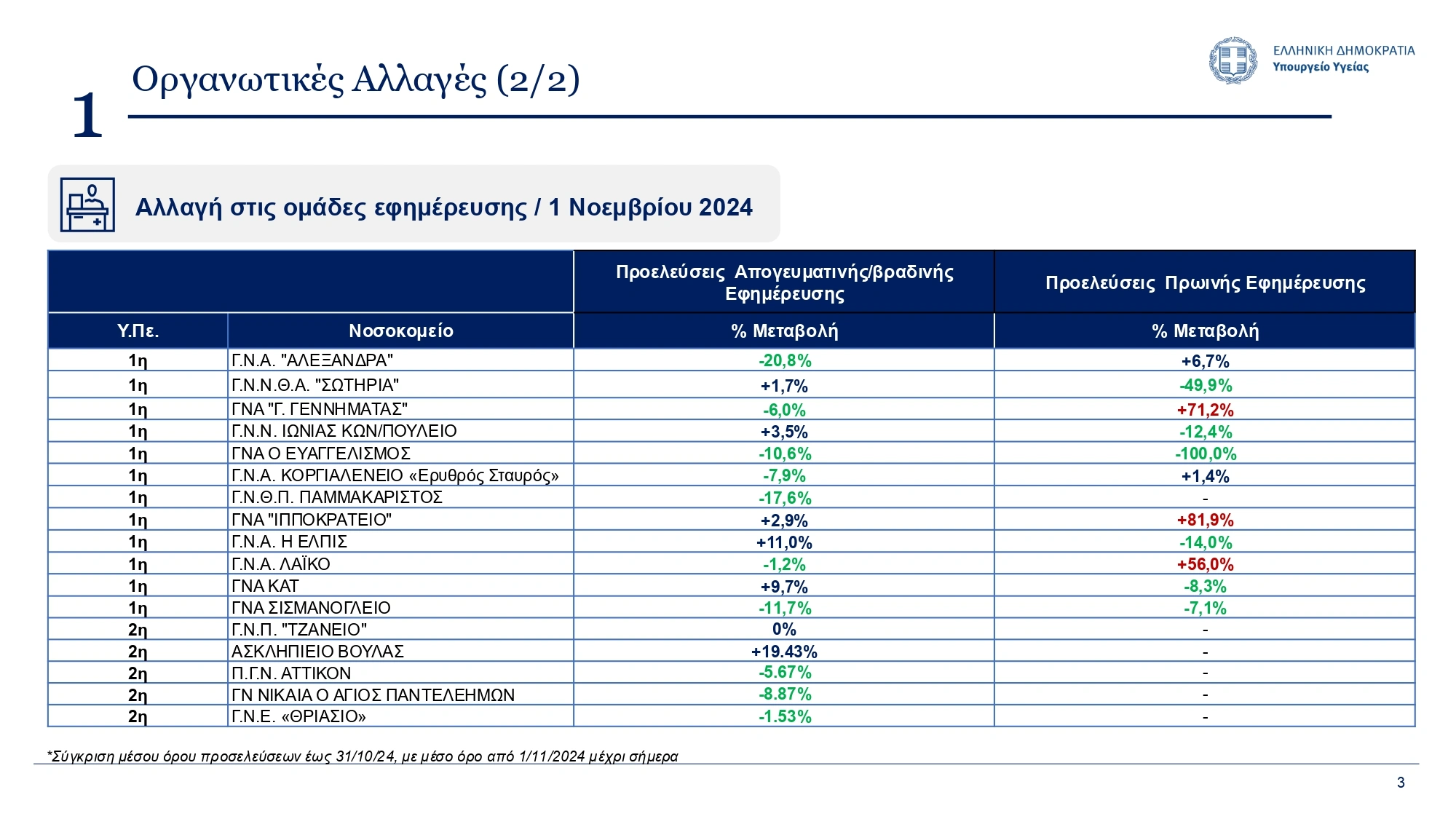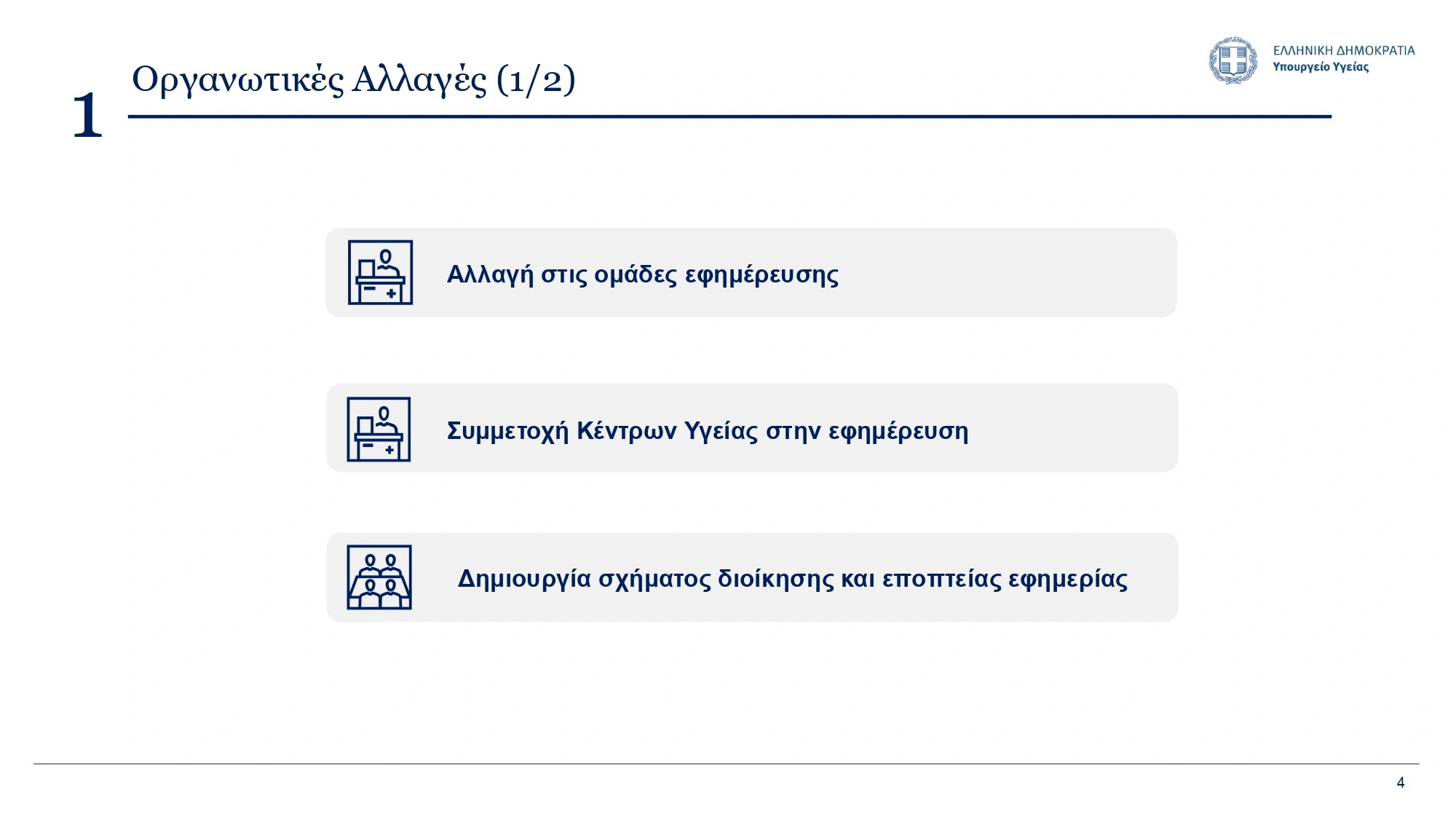 Από την 1η Νοεμβρίου εφαρμόζεται νέα ομαδοποίηση εφημεριών, που έχει ήδη δείξει θετικά αποτελέσματα. Για παράδειγμα, ήδη στο παθολογικό τμήμα του νοσοκομείου Γεννηματάς της Αθήνας παρατηρείται ομαλότερη ροή περιστατικών και ταχύτερη εξυπηρέτηση.