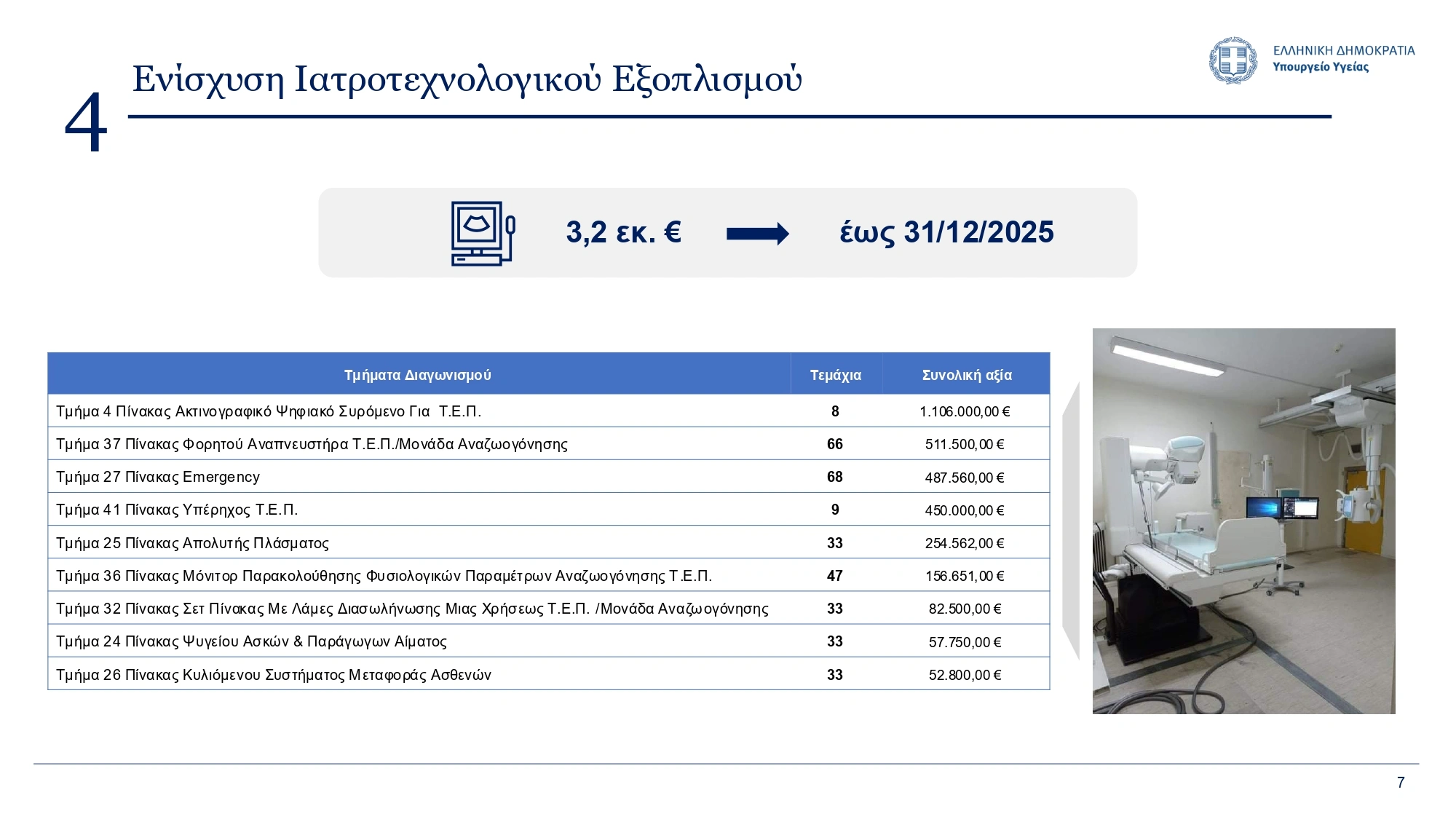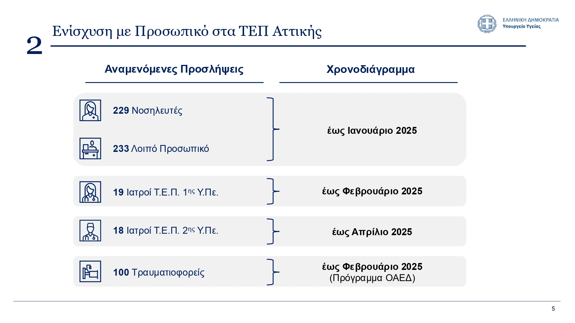 - 400 νέες θέσεις συνολικά για τα ΤΕΠ, εκ των οποίων 75 για το Γενικό Κρατικό Αθηνών Γεννηματάς, 15 για το Ασκληπιείο Βούλας και 33 για το νοσοκομείο Νίκαιας.