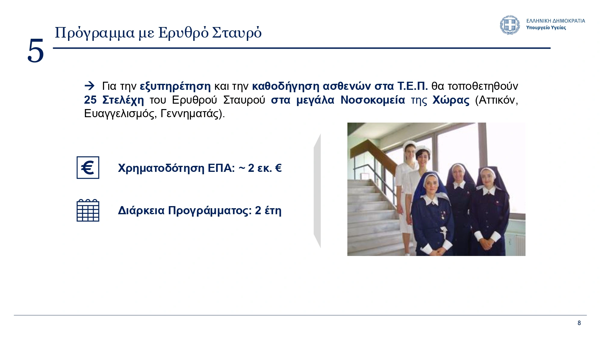 - Από τις 500 προσλήψεις τραυματιοφορέων που βρίσκονται σε εξέλιξη μέσω ΔΥΠΑ, οι 100-180 τραυματιοφορείς θα κατευθυνθούν στα ΤΕΠ.