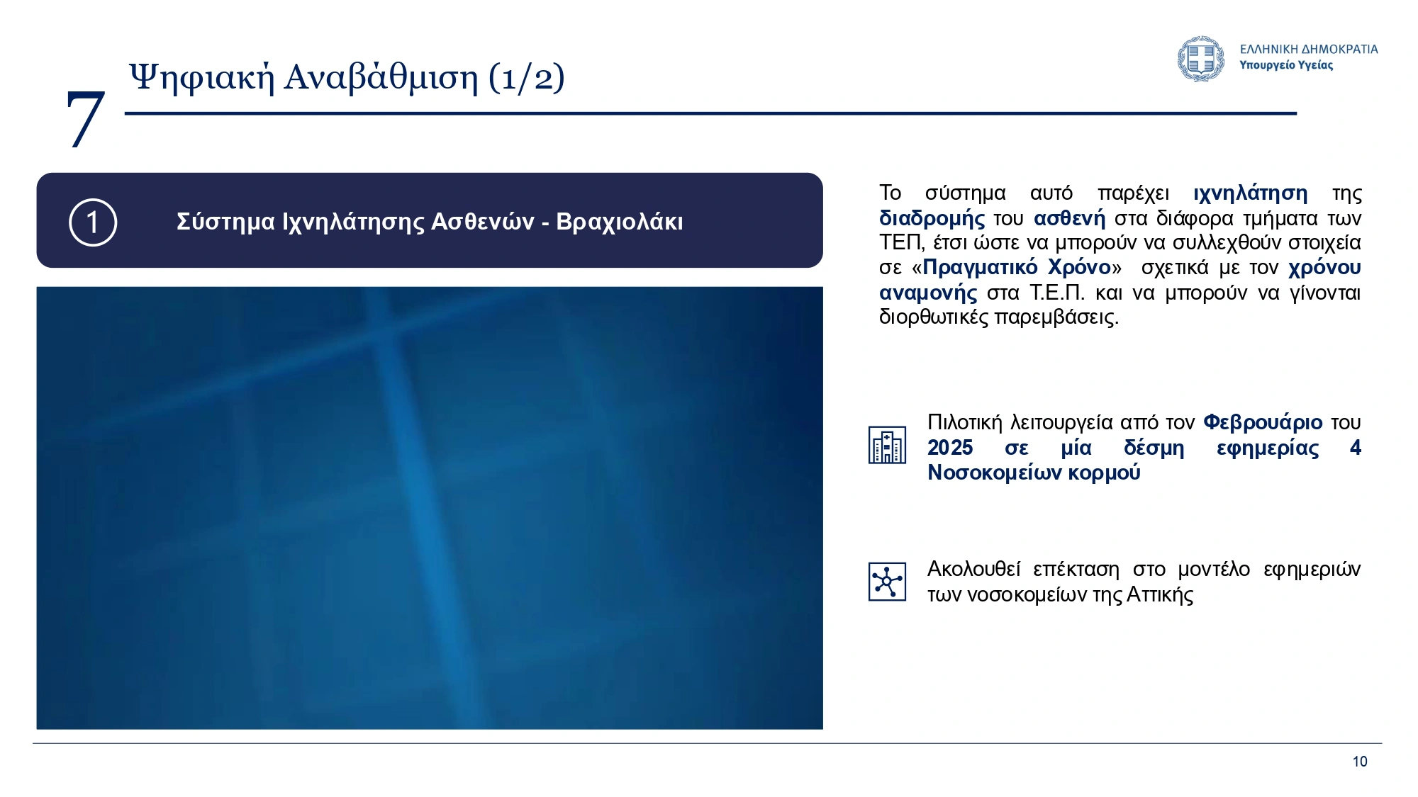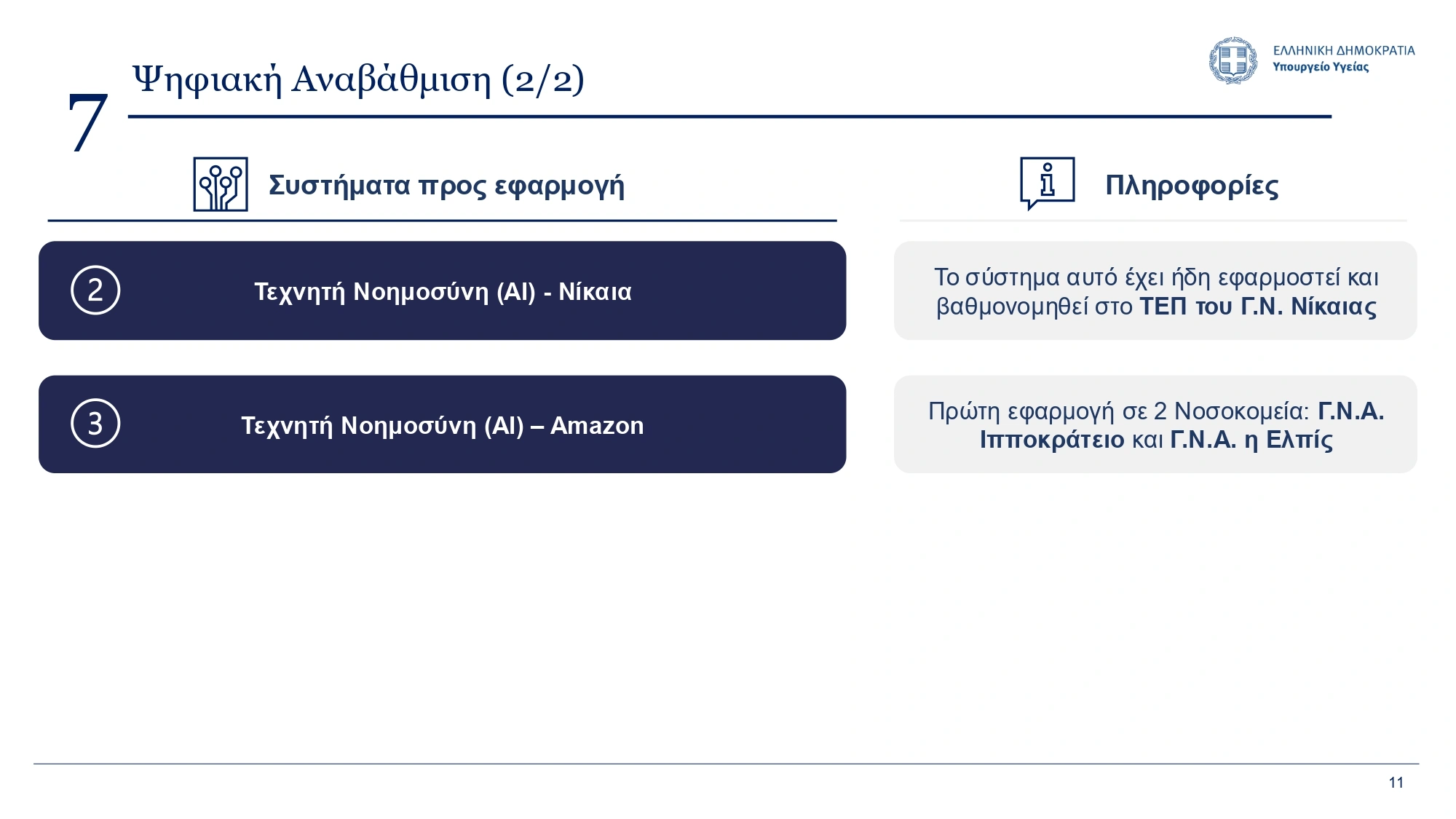 - Τεχνητή νοημοσύνη για κατηγοριοποίηση περιστατικών: Το σύστημα Τεχνητής Νοημοσύνης που εφαρμόζεται πιλοτικά στο Γενικό Κρατικό Νοσοκομείο Νίκαιας, χρησιμοποιεί τεχνολογία AI για να κατευθύνει περιστατικά με fast track διαδικασίες, βελτιώνοντας τη ροή στα Επείγοντα.