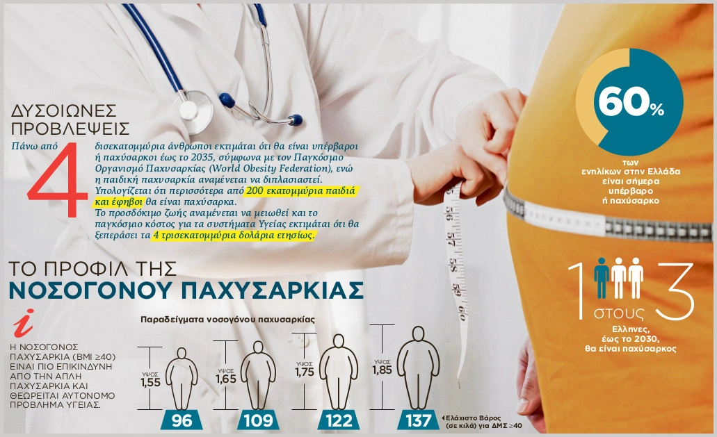 Το 60% των ενηλίκων στην Ελλάδα είναι σήμερα υπέρβαροι ή παχύσαρκοι. Εκτιμάται, δε, πως έως το 2030 σχεδόν 1 στους 3 Ελληνες θα είναι παχύσαρκος, με ετήσιο ρυθμό αύξησης 1,5% από το 2010 έως το 2030. Πίσω από αυτά τα ποσοστά βρίσκονται σιωπηλά ιατρικά δράματα: διαβήτης, καρδιακές ανακοπές, αναπηρίες, απώλεια ζωής. Το ΕΣΥ δεν αντέχει άλλο το κόστος αυτών των χρόνιων νοσημάτων.