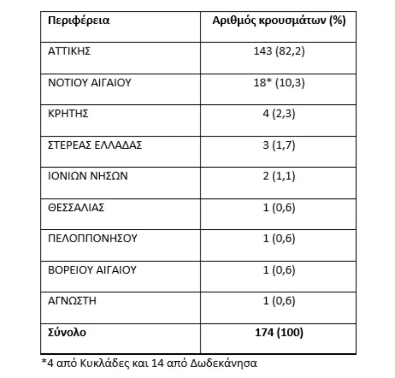 Ενενήντα τέσσερα κρούσματα (80,3%) είχαν ταξιδέψει στις Κυκλάδες, 9 (7,7%) στο Ν. Αιγαίο, 8 (6,8%) στο Ιόνιο, 3 (2,6%) στο Β. Αιγαίο και 3 (2,6%) σε προορισμούς της Ηπειρωτικής Ελλάδας.