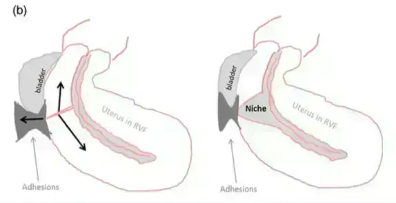 Ο τρόπος επούλωσης της καισαρικής τομής στο σημείο της μήτρας, είναι πολυπαραγοντικός και περιλαμβάνει τις συνθήκες κάτω από τις οποίες έγινε η καισαρική, τον τρόπο συρραφής της μήτρας (δηλ. τα ράμματα που έχουν χρησιμοποιηθεί και το είδος συρραφής) και τις τοπικές συνθήκες επούλωσης οι οποίες είναι απρόβλεπτες και διαφέρουν από γυναίκα σε γυναίκα. Επιπλέον, παράγοντας κινδύνου είναι η οπίσθια κάμψη της μήτρας (μήτρα με κλίση προς τα πίσω).