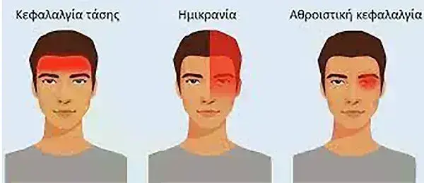 «Κεφαλαλγία τάσης: Αποτελεί τη συνηθέστερη μορφή κεφαλαλγίας. Χαρακτηρίζεται από το αίσθημα ότι κάτι πιέζει το κεφάλι του ασθενούς αμφοτερόπλευρα. Δεν είναι τόσο έντονο ώστε να επηρεάσει τη δραστηριότητά του, ενώ εμφανίζει σταδιακή επιδείνωση. Ως εκλυτικοί παράγοντες έχουν ενοχοποιηθεί το άγχος, οι ορμονικές μεταβολές, η μεταβολή του καιρού, διάφορα οπτικά ερεθίσματα, το αλκοόλ, η κόπωση, η νηστεία, οι διαταραχές ύπνου, η κακή στάση σώματος, η