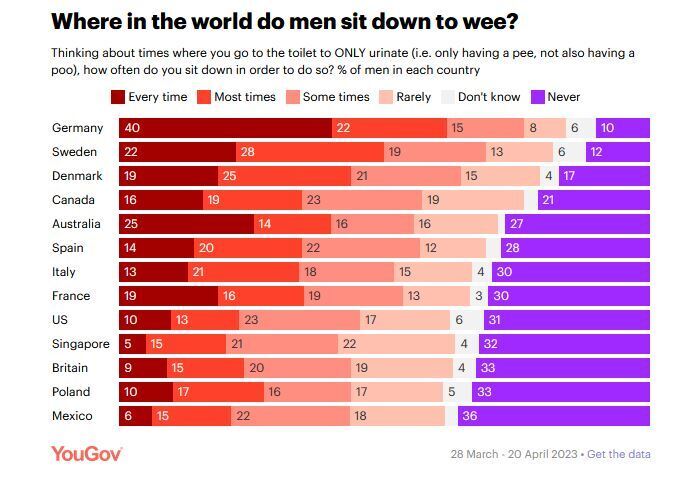 Στη δημοσκόπηση συμμετείχαν άνδρες από 13 χώρες, στους οποίους ζητήθηκε να αναφερθούν στις συνήθειές τους στο μπάνιο. Το 62% των Γερμανών απάντησαν ότι τους αρέσει να κάθονται στη λεκάνη για να ουρήσουν, ενώ το 39% των Αυστραλών παραδέχθηκε ότι ακολουθεί την ίδια διαδικασία.