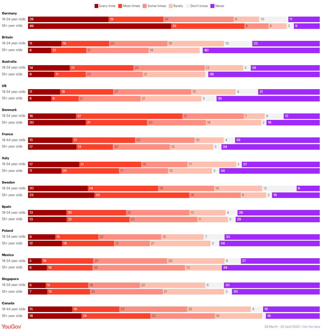 Ένας στους δύο (50%) Σουηδούς απάντησε ότι προτιμά να κάθεται. Στην Ιταλία το ποσοστό είναι μικρότερο με 34%, ωστόσο η χώρα στην Ευρώπη με το μικρότερο ποσοστό είναι η Βρετανία με 24%.