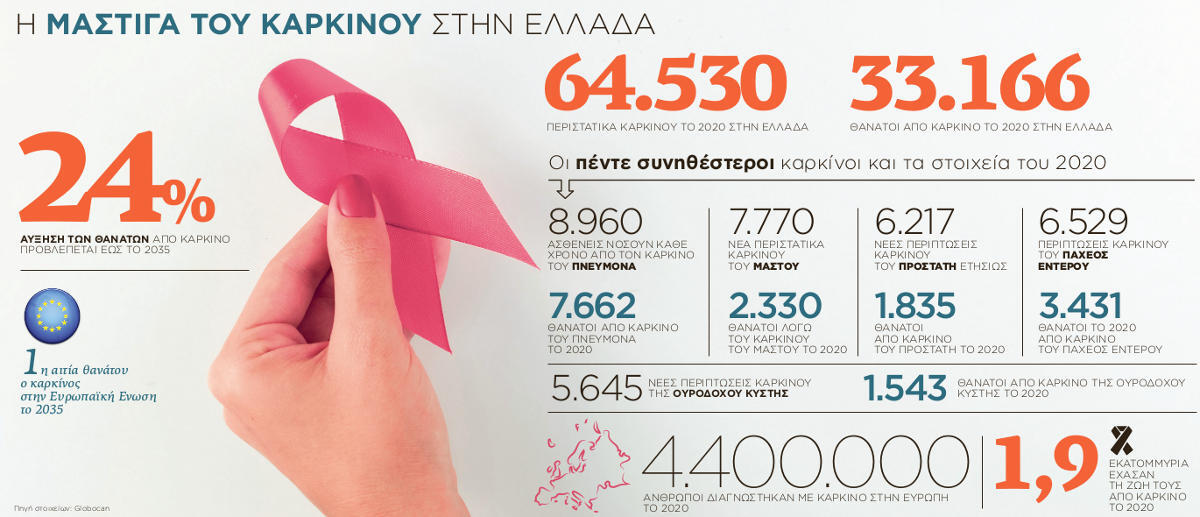 Σύμφωνα με τα τελευταία δεδομένα που αφορούν στο 2020, στην Ελλάδα καταγράφηκαν 64.530 νέα περιστατικά καρκίνου και 33.166 θάνατοι εξαιτίας του καρκίνου. Ο καρκίνος του πνεύμονα, του παχέος εντέρου, του μαστού, του προστάτη και της ουροδόχου κύστης είναι οι πέντε συνηθέστεροι τύποι καρκίνου στη χώρα μας, που αντιπροσωπεύουν το 56,5% του συνόλου των περιστατικών καρκίνου στην Ελλάδα.