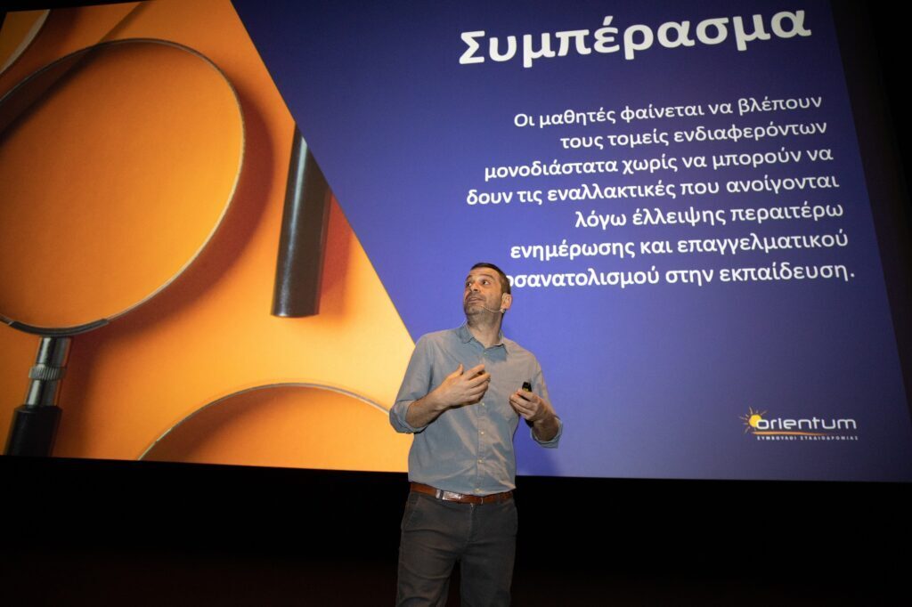 Ο εισηγητής της εκδήλωσης κ. Αποστόλης Τζιανάκης, Σύμβουλος Σταδιοδρομίας της Orientum, εντυπωσίασε το κοινό με την παρουσίαση του με θέμα τα «Επαγγέλματα του 2030», κατά την οποία ανέλυσε θεματικές, όπως οι συμπεριφορές των ανθρώπων που πετυχαίνουν, η στοχοθεσία, το εκπαιδευτικό σύστημα και τα Πανεπιστήμια στη χώρα μας, πώς ένας σπουδαστής μπορεί να βελτιωθεί μέσα στη σχολή του, τις απαραίτητες κοινωνικές δεξιότητες που απαιτούνται πλέον στην αγορά εργασίας, καθώς και τα επαγγέλματα που θα πρωταγωνιστήσουν στο μέλλον.