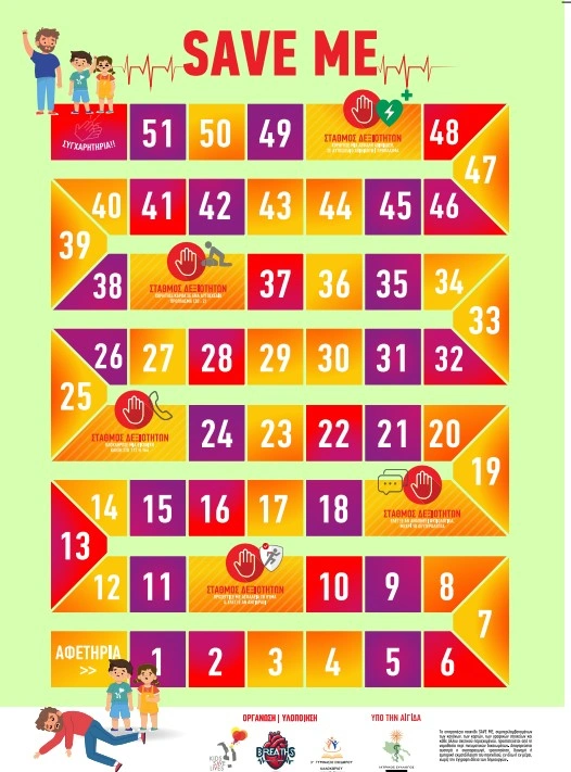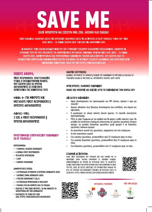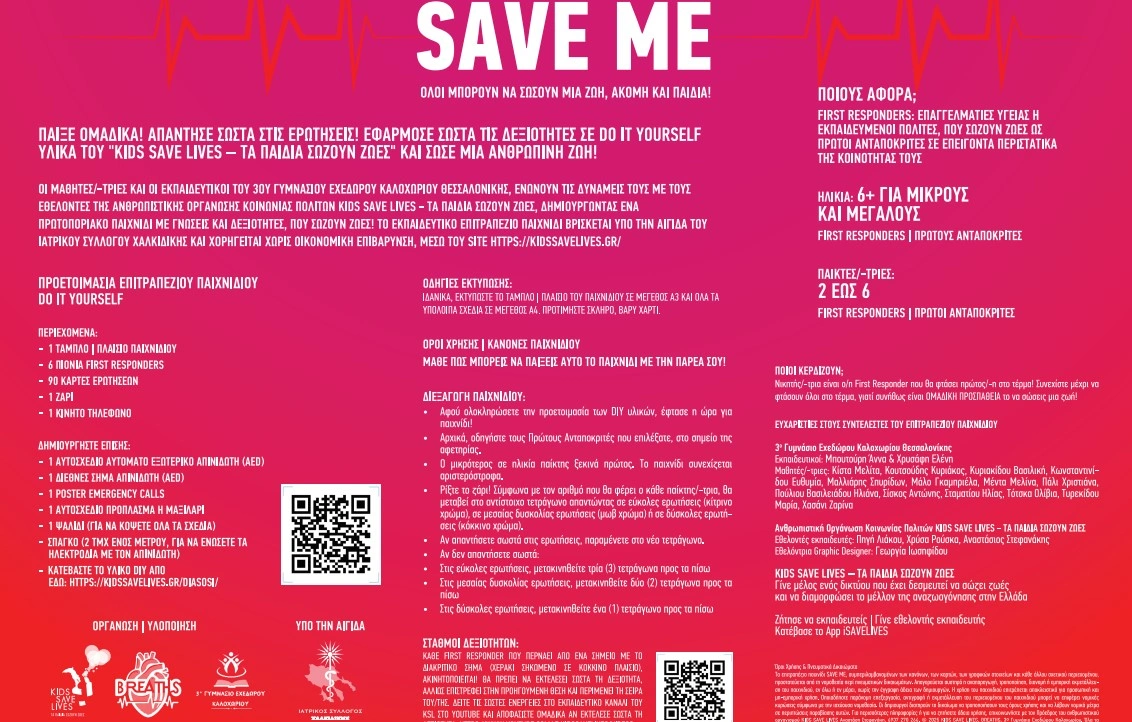 Σε συνεργασία με την Ανθρωπιστική Οργάνωση KIDS SAVE LIVES και υπό την αιγίδα του Ιατρικού Συλλόγου Χαλκιδικής, οι μαθητές δημιούργησαν το πρωτότυπο επιτραπέζιο παιχνίδι πρώτων βοηθειών “Save Me”.