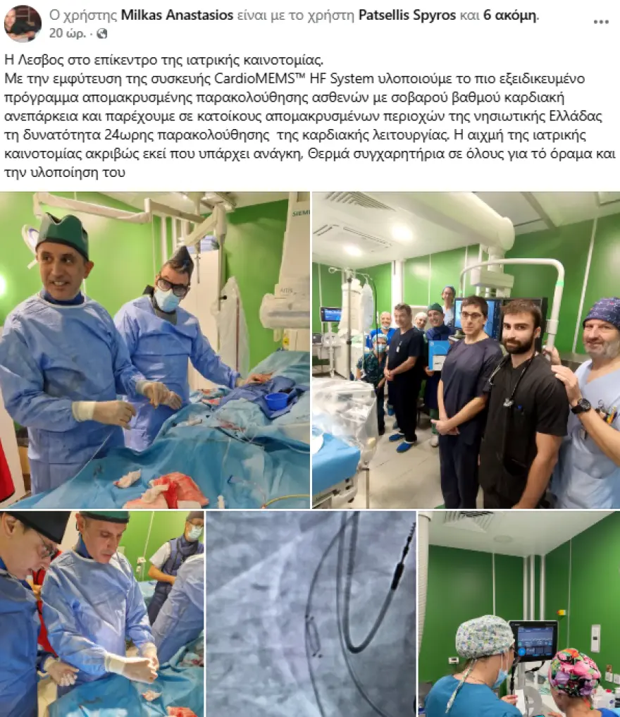 Ο επεμβατικός καρδιολόγος Αναστάσιος Μίλκας, επισκέπτης γιατρός στο νοσοκομείο Μυτιλήνης και αντιπλοίαρχος του Πολεμικού Ναυτικού, με την ομάδα του Αιμοδυναμικού, με επικεφαλής τον διευθυντή της Καρδιολογικής Κλινικής Παναγιώτη Ανδρόνικο και με τη συμμετοχή γιατρών και τεχνολόγων από την Αμερική, την Ισπανία, την Ιταλία και την Αθήνα, τοποθέτησαν έναν ειδικό αισθητήρα στην καρδιά ενός 58χρονου Μυτιληνιού ασθενούς με πολύ σοβαρά καρδιολογικά προβλήματα.
