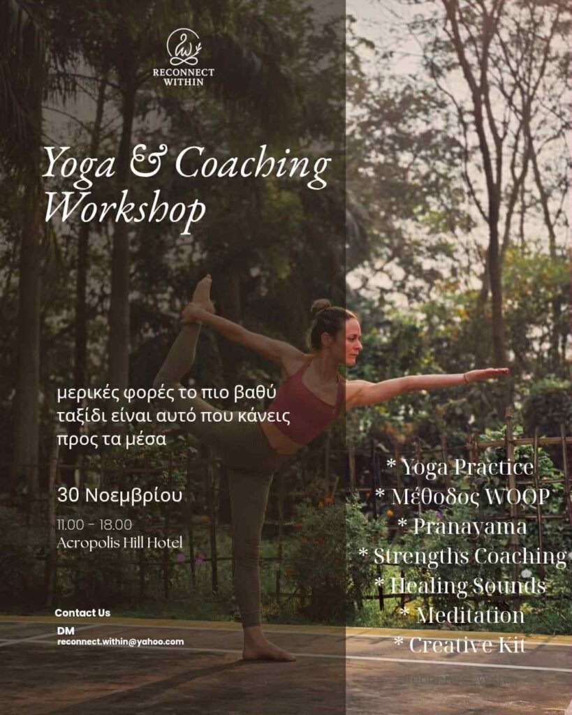 Η ιδέα του Reconnect Within γεννήθηκε από την ανάγκη να δημιουργήσουμε από κοινού με την Πόπη Δημητροπούλου μια ολιστική δράση, όπου ο άνθρωπος μπορεί να σταματήσει, να αναπνεύσει και να επανέλθει σε ισορροπία. Μέσα από τις συζητήσεις μας, νιώσαμε και οι δυο αμέσως ότι -η κάθε μία στο δικό της κομμάτι, με την δική της προσέγγισή- θέλουμε να μεταδώσουμε ακριβώς το ίδιο. Συνδυάζουμε στο workshop την πρακτική της Yoga με τη μεθοδολογία του Coaching, ώστε ο συμμετέχων να βιώσει μια εμπειρία που κινητοποιεί σώμα, νου και συναίσθημα. Μέσα από την τέχνη της κίνησης του σώματος, την αναπνοή και τη συνειδητή καθοδήγηση, το άτομο οδηγείται να συνδεθεί πιο βαθιά με τον εαυτό του και να ξαναβρεί οργανικά εσωτερική ανάταση και ροή. Είναι ένα ολοκληρωμένο σεμινάριο, μια μέρα εσωτερικής επανασύνδεσης και αναγέννησης μέσο των πρακτικών τόσο της Υoga όσο και του Coaching
