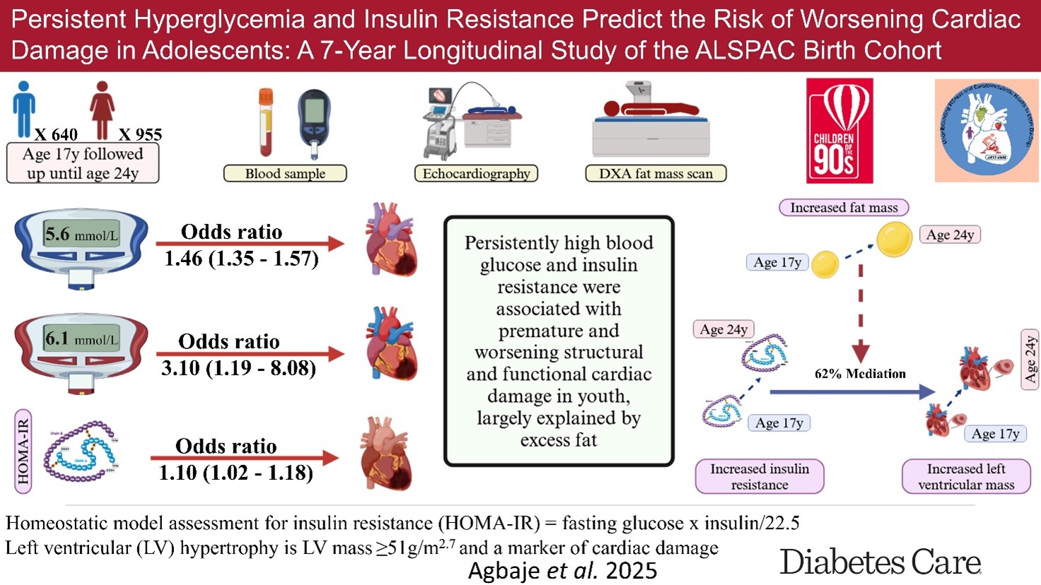 Το επίμονα υψηλό σάκχαρο νηστείας πάνω από 5,6 mmol/L από την ηλικία των 17 έως τα 24 έτη συσχετίστηκε με 46% αυξημένο κίνδυνο υπερτροφίας αριστερής κοιλίας. Ο κίνδυνος ήταν τριπλάσιος εάν το σάκχαρο νηστείας ήταν επίμονα πάνω από 6,1 mmol/L. Το υψηλό σάκχαρο στο αίμα μείωσε επίσης τη χαλάρωση του καρδιακού μυός, αλλοίωσε τη φυσιολογική καρδιακή λειτουργία και αύξησε υπερβολικά την πίεση της ροής του αίματος που επέστρεφε στην καρδιά. Η επίμονη αντίσταση στην ινσουλίνη συσχετίστηκε με 10% αυξημένο κίνδυνο πρόωρης και επιδεινούμενης καρδιακής βλάβης, περισσότερο στις γυναίκες.